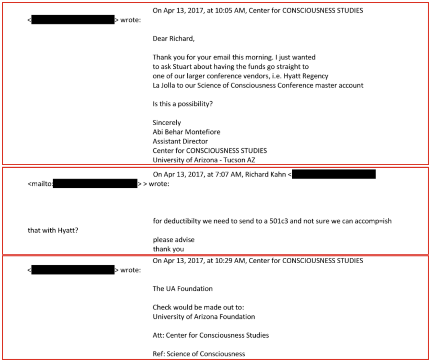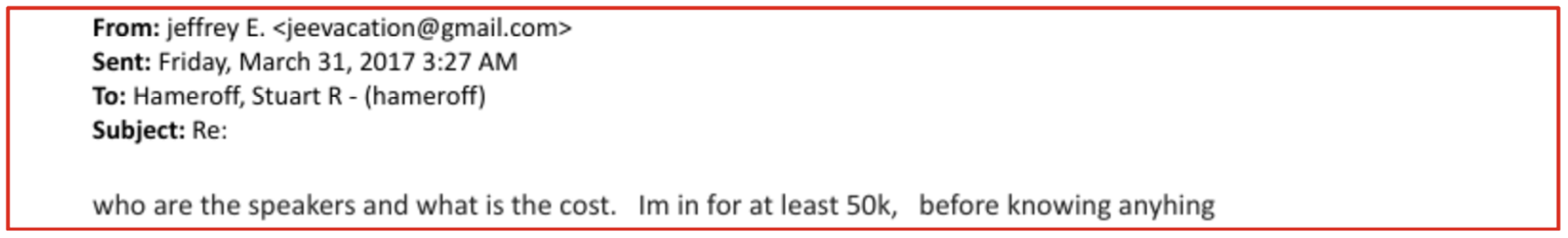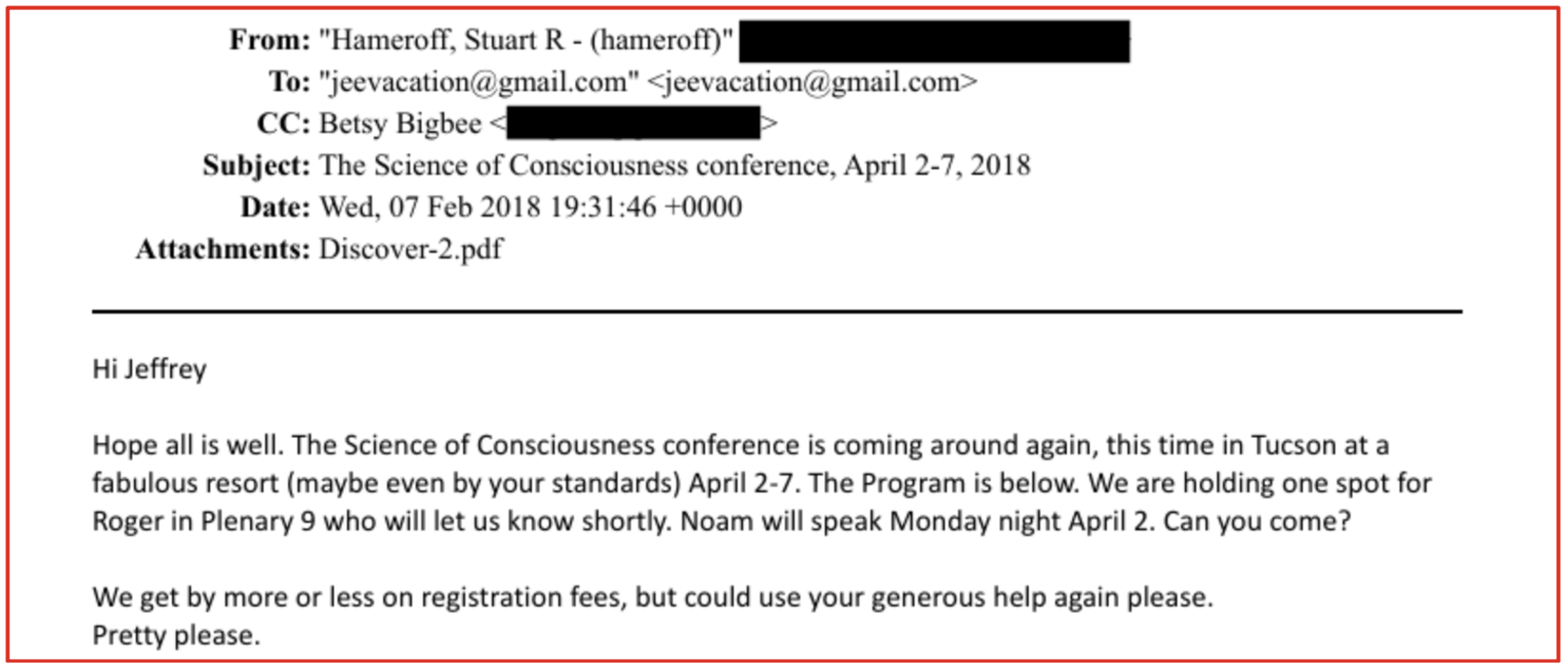 In March 2017, UA professor Stuart Hameroff (using his arizona.edu email address) messaged Epstein about an upcoming program being put on by the university’s Center for Consciousness Studies, of which he was the director. Epstein, who had an existing relationship with Hameroff, pledged “at least 50k, before knowing any[t]hing” and asked for more information about the program’s budget and lineup.