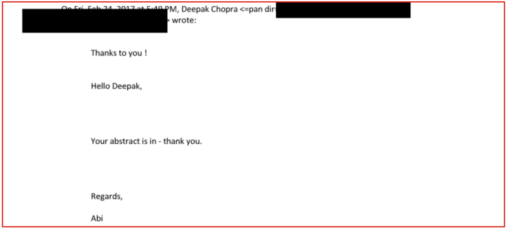 In February 2017, Abi Behar Montefiore (the UA center’s assistant director) wrote to Deepak Chopra: “Your abstract is in – thank you.” Chopra forwarded the message to Epstein: “Thanks to you!”