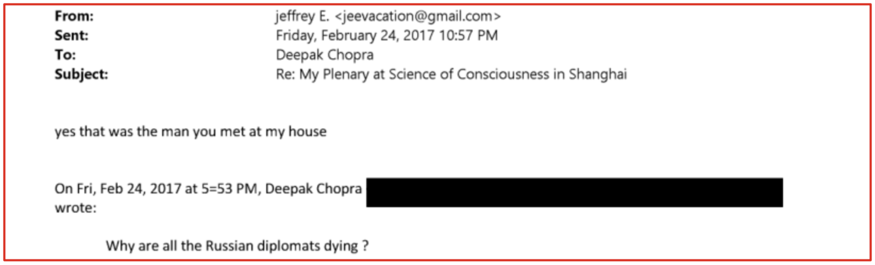 The remainder of the duo’s conversation is scattered and fairly bizarre, with Epstein inquiring about where Chopra was at the moment and Chopra asking: “Why are all the Russian diplomats dying?” The financier responded: “[Y]es that was the man your met at my house.” It’s unclear whether the two were referencing the university’s abstract or accidentally were talking around each other.