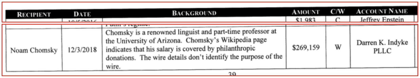 In December 2018, according to a presentation that Deutsche Bank compiled for the U.S. Attorney’s Office about “Epstein employees/affiliates,” the financier’s attorney wired $269,159 to Noam Chomsky through his firm (Darren K. Indyke PLLC). The presentation describes Chomsky as “a … part-time professor at the University of Arizona” and notes that “[t]he wire details don’t identify the purpose of the wire.”
