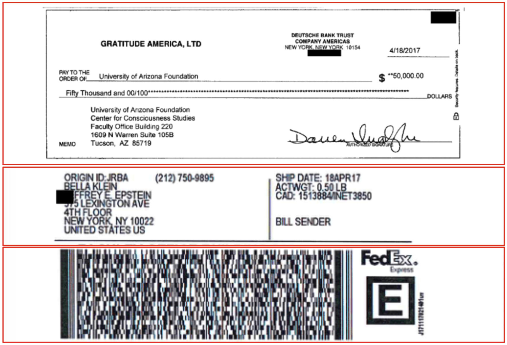 Epstein and his team cut the $50,000 check five days later as directed by UA. The university received it in a large FedEx envelope with the sender clearly marked as “Jeffrey E. Epstein.”