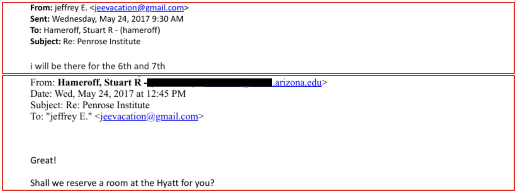 As the conference approached, Epstein confirmed that he would be attending and Hameroff offered that “we” could “reserve a room at the Hyatt for you.”