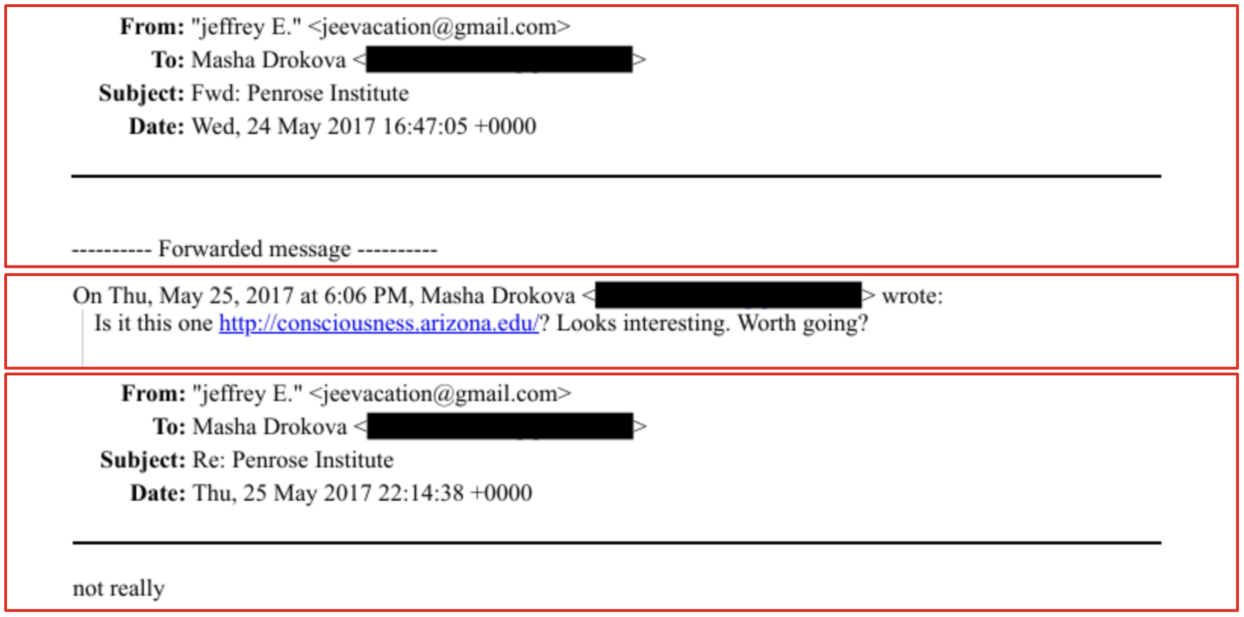 He forwarded the email chain to Masha Drokova, the star of the 2012 documentary “Putin’s Kiss” who was working as the financier’s publicist at the time. Drokova said that the conference “[l]ooks interesting” and asked whether it was worth her going, too. Epstein responded no.