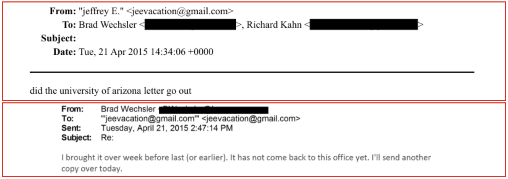 In April of that year, Epstein asked Brad Wechsler, the head of Apollo Global Management CEO Leon Black’s family office, whether “the [U]niversity of [A]rizona letter [went] out.” Wechsler responded that he had brought it over but that it hadn’t returned to his office, so he was going to “send another copy over today.”