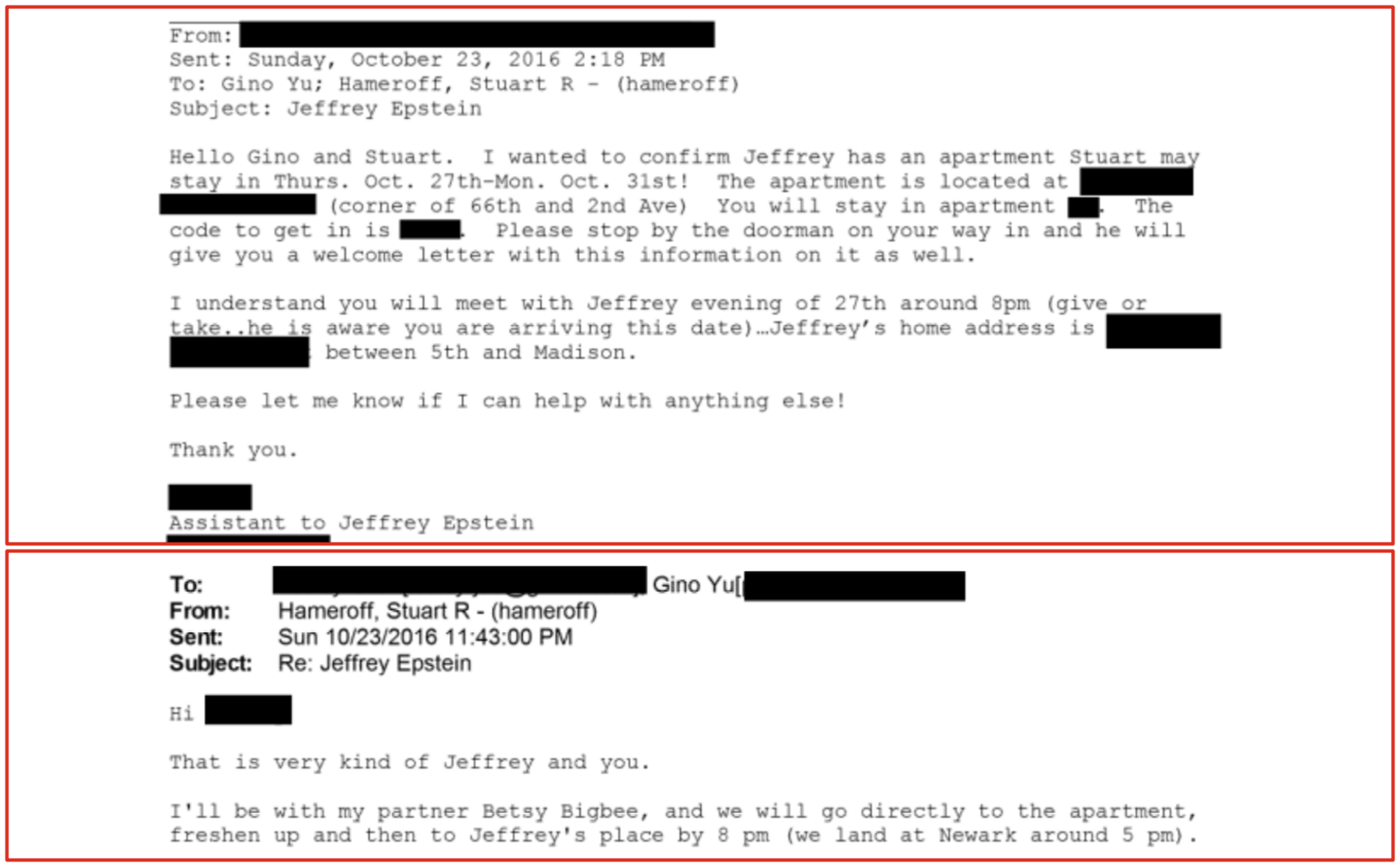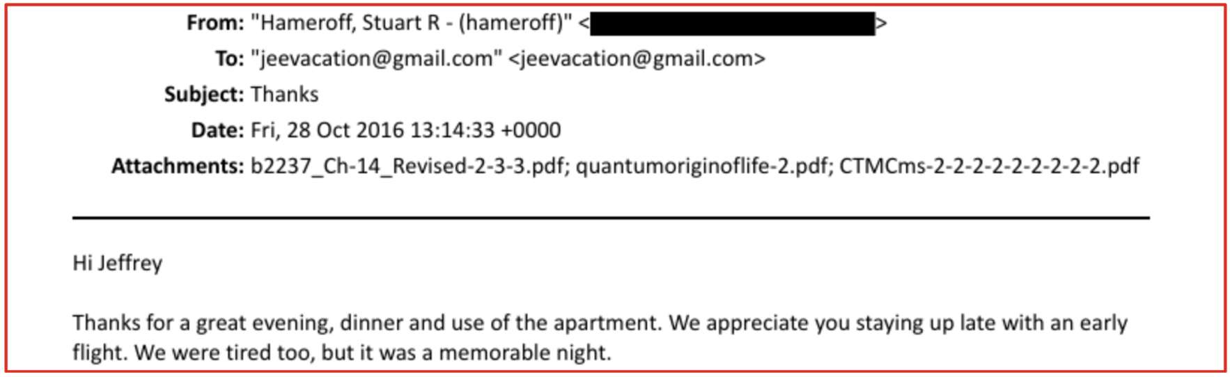Hameroff responded: “That is very kind of Jeffrey and you. I’ll be with my partner Betsy Higbee, and we will go directly to the apartment, freshen up and then to Jeffrey’s place by 8 pm (we land at Newark around 5 pm).”