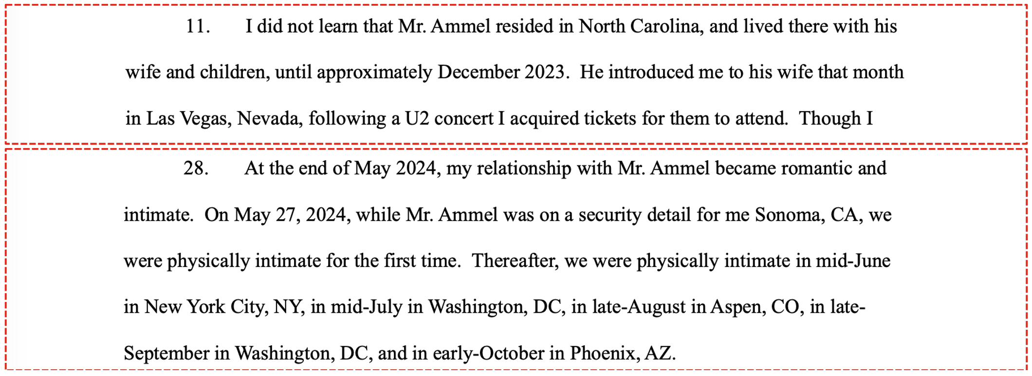The former U.S. senator admits that she met her bodyguard’s wife in December 2023 “following a U2 concert I acquired tickets for them to attend” and that “my relationship with [her security guard] became romantic” in May 2024. She then details (in truly bizarre fashion) all of the times that “we were physically intimate,” including specific dates and locations.