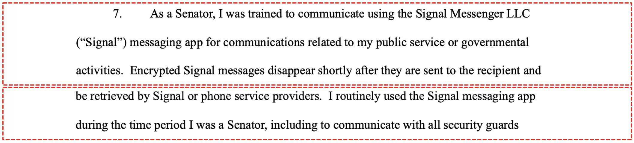 Interesting, she also noted: “As a Senator, I was trained to communicate using the Signal Messenger LLC (‘Signal’) messaging app for communications related to my public service or governmental activities … I routinely used the Signal messaging app during the time period I was a Senator …”